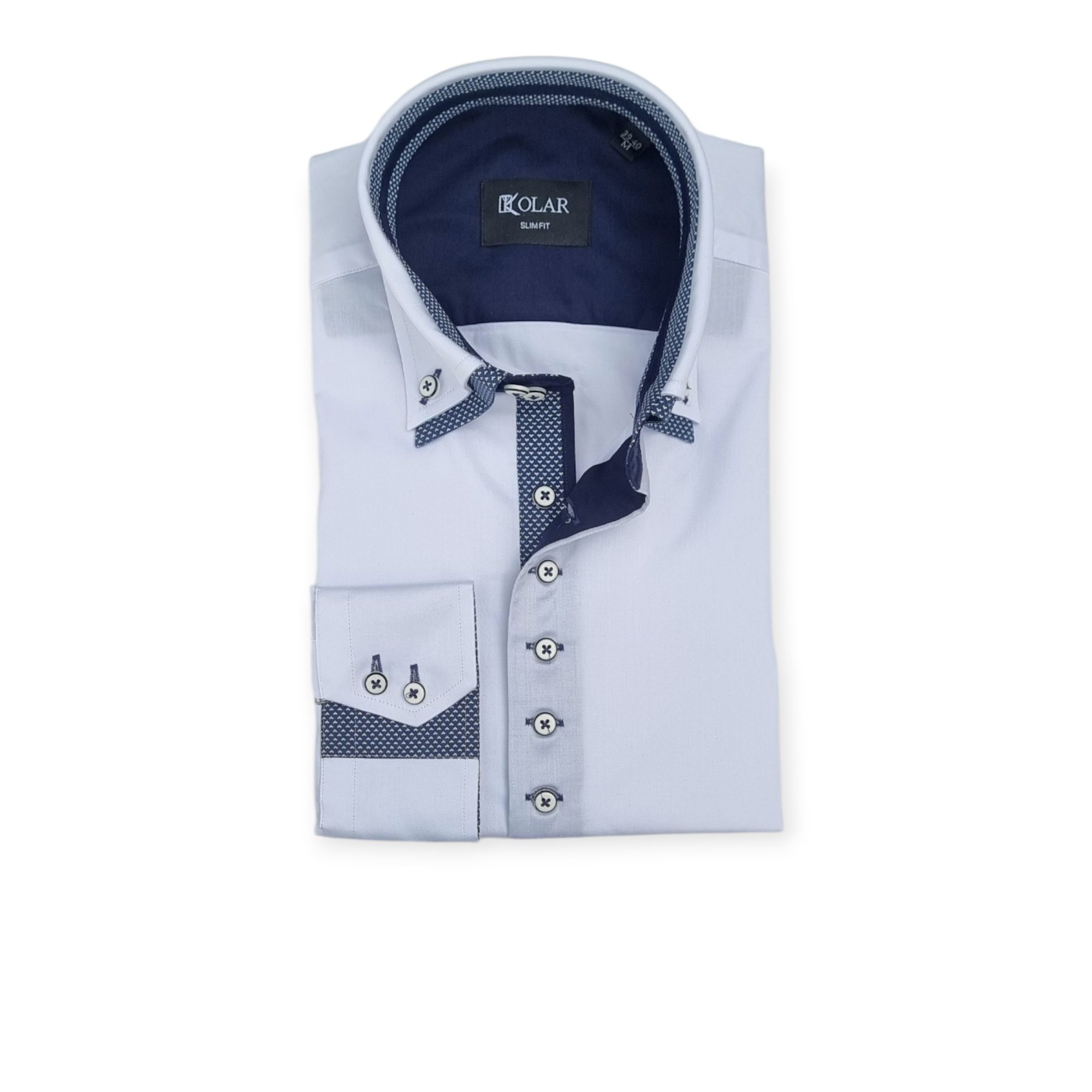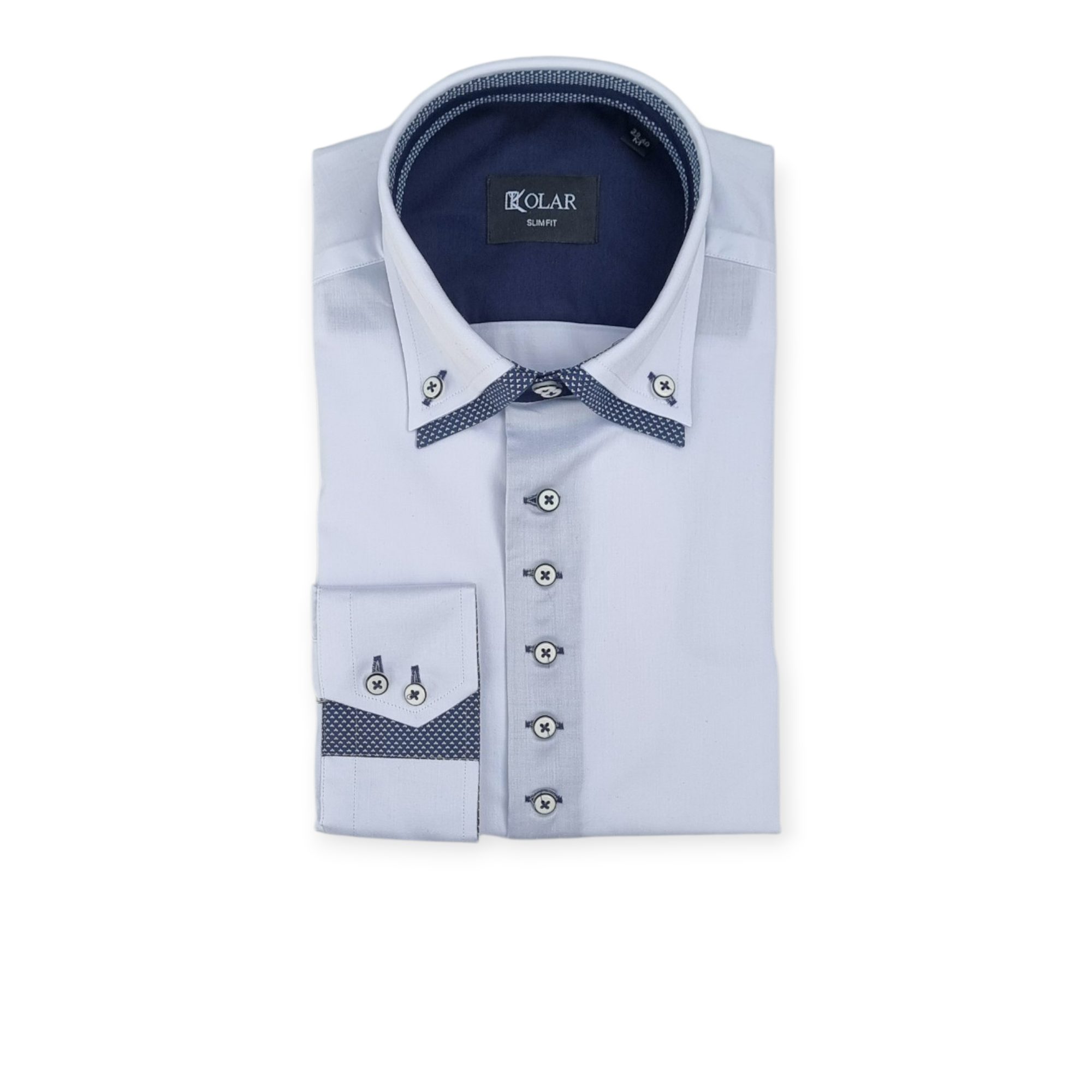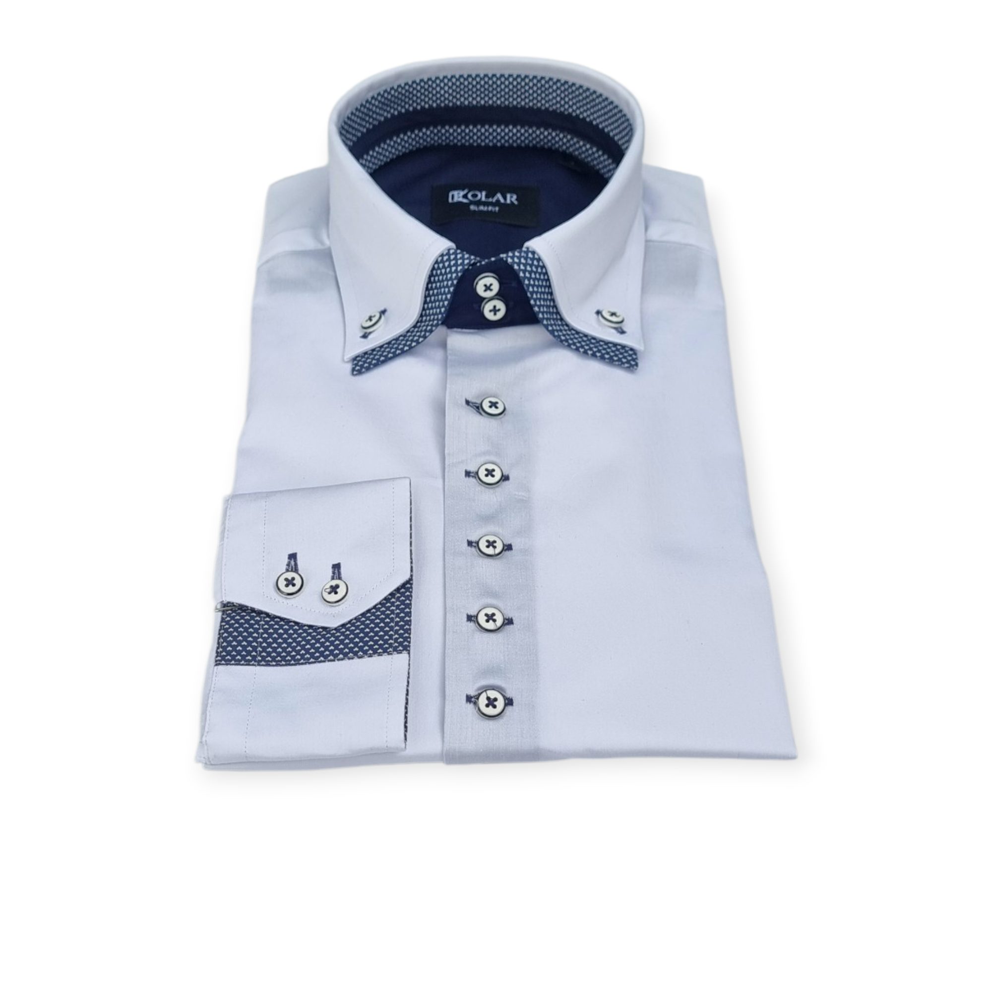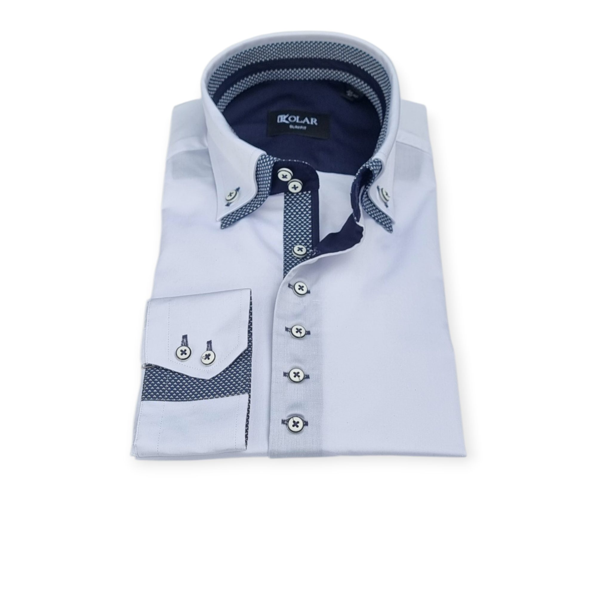 Elegantna in modna moška srajca z dolgimi rokavi v beli barvi in dvojnim ovratnikom z modrimi detajli. Na voljo je slim fit in regular fit različica, za udobnost pa poskrbi kombinacija 97 % bombaža in 3 % elastana. Srajca je primerna za posebne priložnosti, ali kot del poslovne obleke s kravato. Kombinirate jo lahko tudi za vsak dan, na elegantne hlače ali jeans.